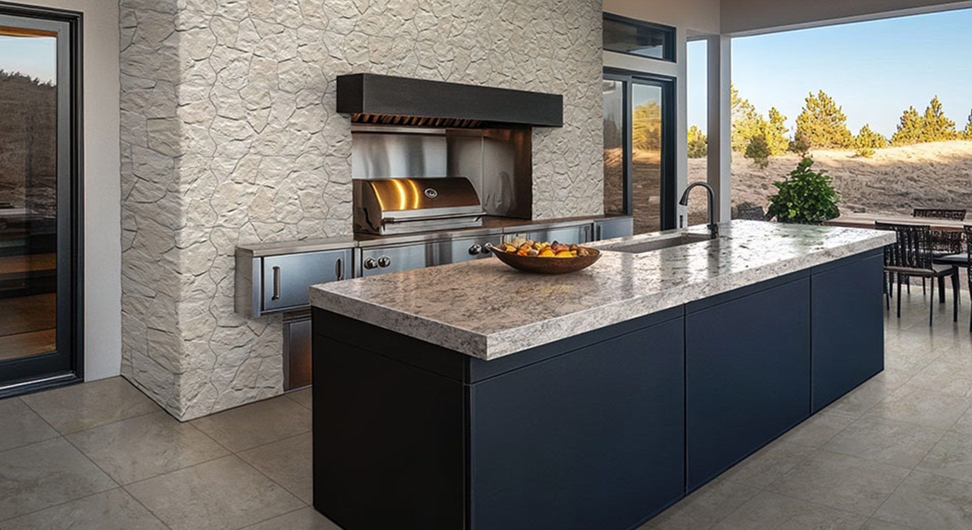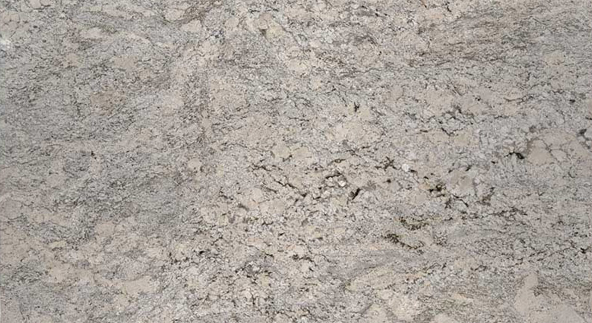 Alpine Valley granite countertops are slabs of dazzling natural stone from India with their warm white backgrounds and scattered beige, charcoal, and black accents. The high-variation counters come with a polished finish and can create a fabulous tone-on-tone look installed over medium wood cabinetry or standout style atop lighter cabinetry.