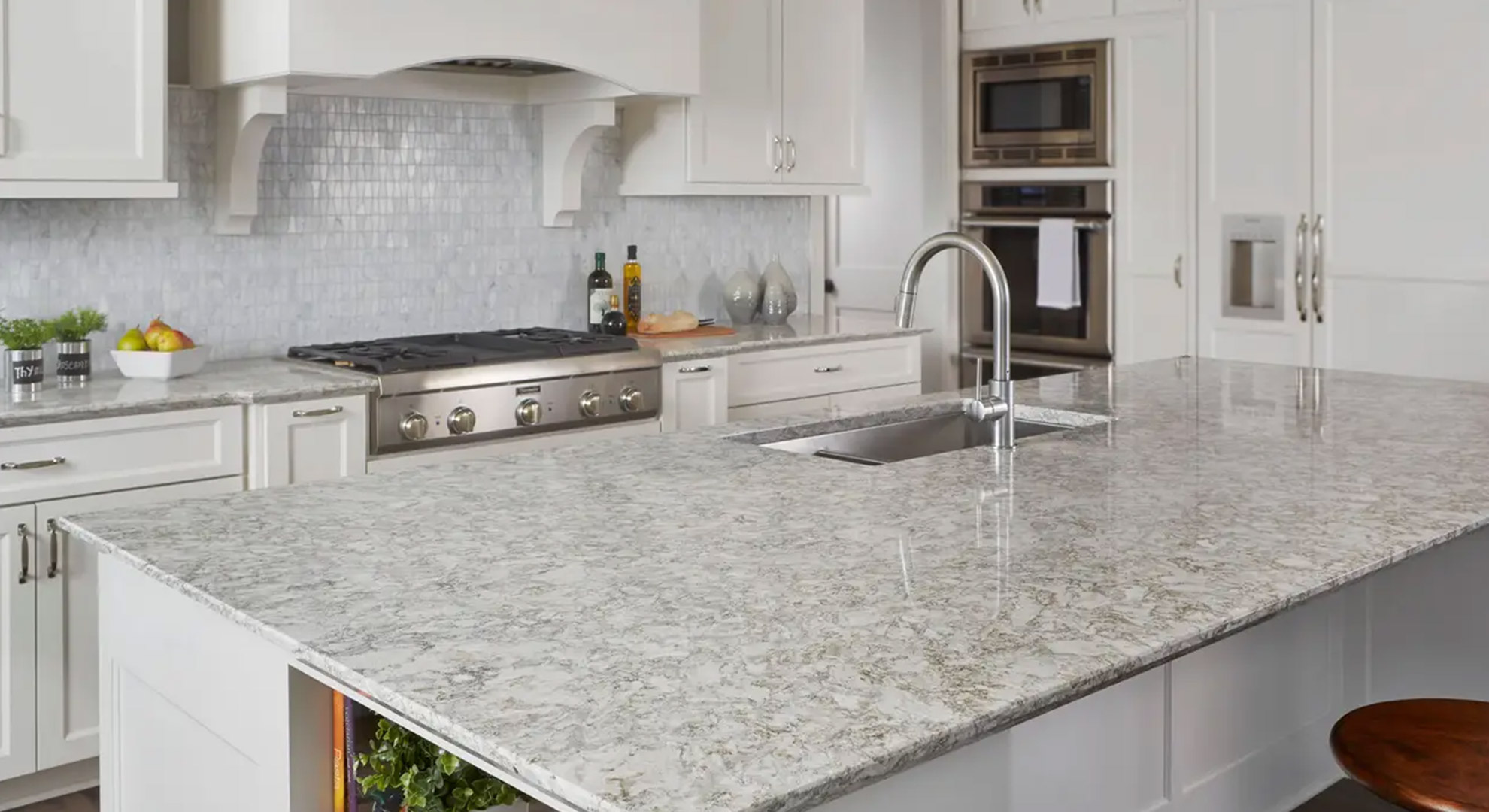 Berwyn convenes swirls of whites, ivories, and creams with subtle gray veins and hints of gold and silver radiance throughout.